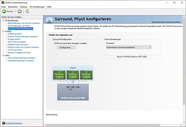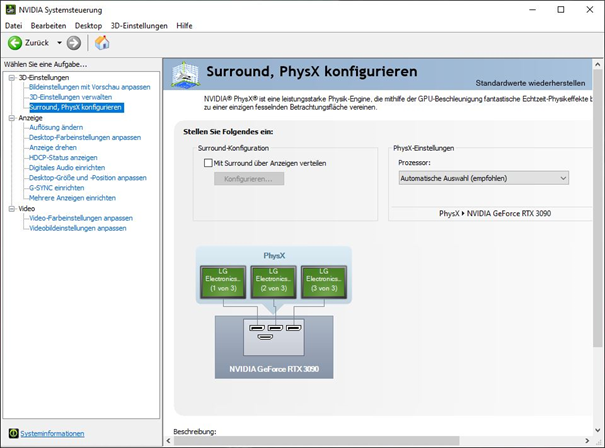 Glücklicherweise gibt es hier weniger Probleme beim Einrichten des Setups. Die drei Monitore können an der RTX 3090 mittels Displayport angeschlossen werden.