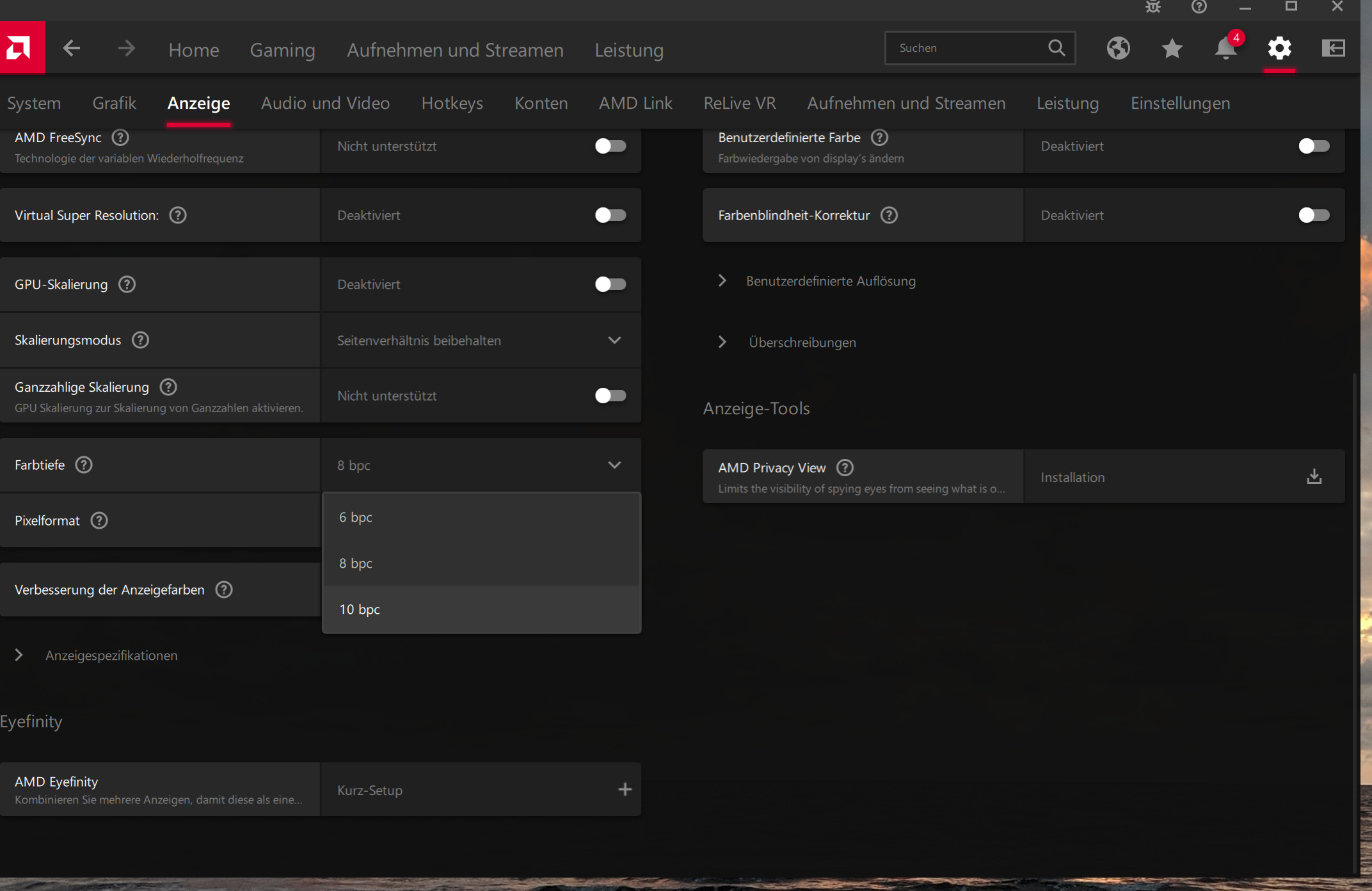Ich habe mal im Treiber rumgeklickt und die Farbtiefe von 10 auf 8 bpc geändert und nun kann ich Eyefinity aktivieren....