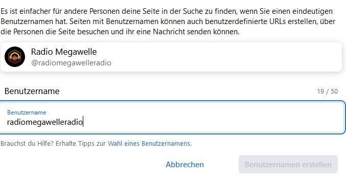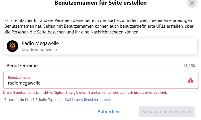 Hallo zusammen, ich wollte für unser Schulradio auf unserer Facebokseite den Benutzernamen ändern. Warum? Damit man die Seite besser in den Browser schreiben kann. Geht aber nicht, Facebook nimmt keine Namensänderung an. Ich habe natürlich auch andere Namen versucht, geht nicht. Warum? Was mache ich falsch?