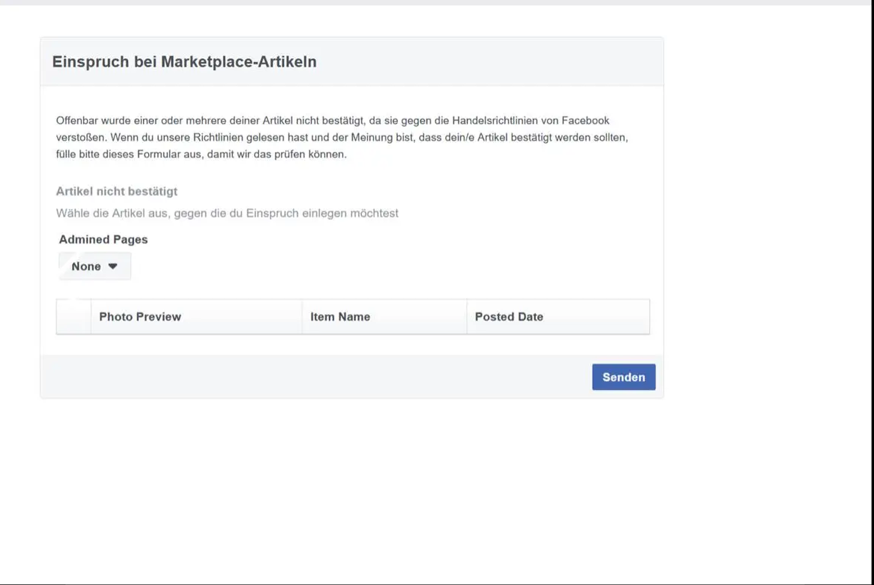 Möglicherweise wird dir diese Nachricht angezeigt, weil du erst vor Kurzem Facebook beigetreten bist, weil Marketplace in deinem Land noch nicht verfügbar ist, oder weil dein Konto nicht den erforderlichen Kriterien entspricht. In unserem Hilfebereich findest du weitere Informationen."