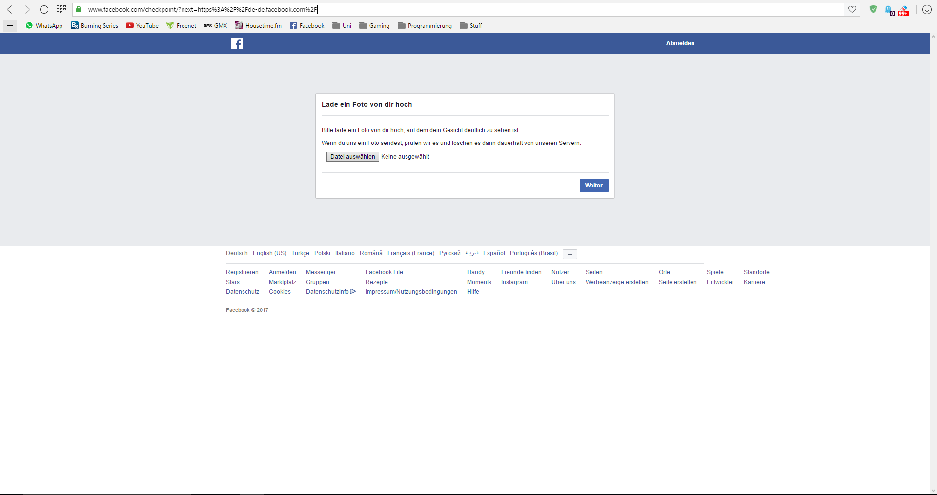 folgendes Problem: Ich bin seit knapp 2 Monaten bei Facebook und hatte bisher auch keine Probleme. Jetzt verlangt aber Facebook nachdem ich mich eingeloggt habe (und bevor ich irgendetwas machen kann) nach einem Foto von mir mit folgender Nachricht: