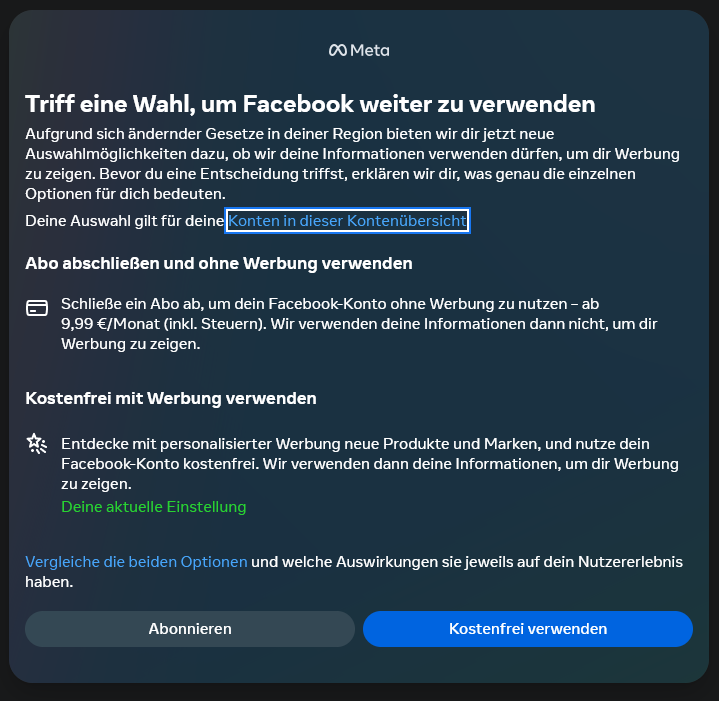 Facebook möchte von mir plötzlich eine Zustimmung Informationen aus meinem Konto zu verwenden, um mir personalisierte Werbung zu zeigen. Kann ich da irgendwie nicht zustimmen? Oder muss ich dann meinen Facebookaccount löschen?