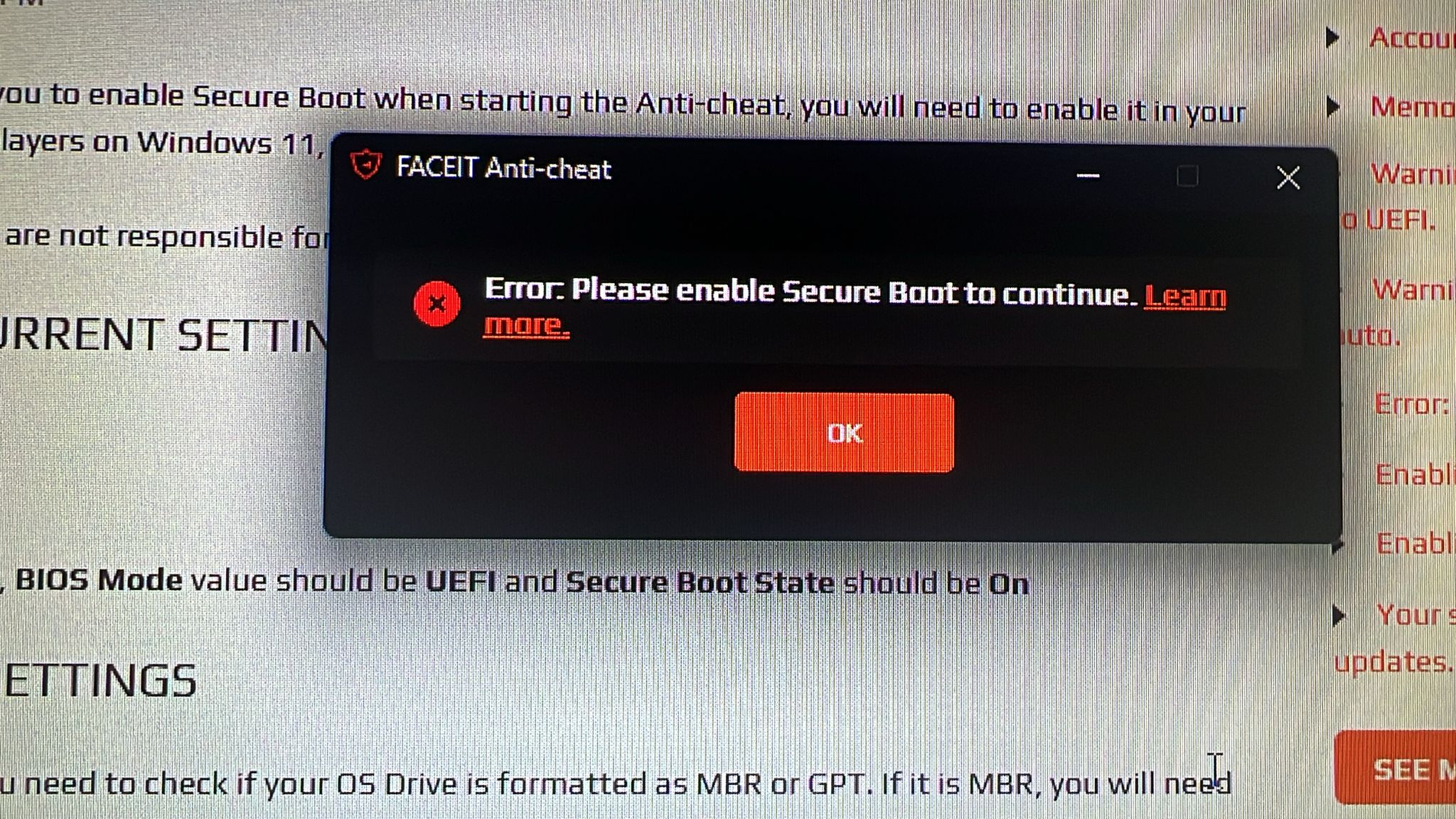 Habe dann mal auf meinem Win 11 System diese Faceit Anti Cheat installiert, bekomme die selbe Fehlermeldung, ich habe ein Gigabyte X299X Aorus Master auch mit aktiven Secure Boot im BIOS und in System info zeigt er an sei sein aus.