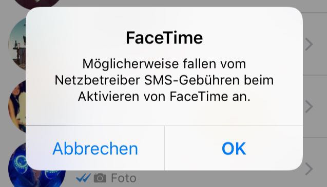 Hey Leute, seit ein paar Wochen bekomme ich ständig von FaceTime die Mitteilung : "Möglicherweise fallen vom Netzbetreiber SMS-Gebühren beim Aktivieren von FaceTime an." Wenn ich auf Abbrechen drücke passiert nichts, jedoch kommt die Mitteilung in den nächsten 1-2 Tage dann erneut, drücke ich jedoch OK kriege ich von meinem Anbieter zich Nachrichten in denen steht, dass die SMS nicht zugestellt werden konnte, weil es die eingegebene Nummer nicht gibt oder mein Guthaben nicht reicht. An manchen Tagen hatte ich sogar über 30 Nachrichten davon, was irgendwann wirklich nervt. Habe das Handy jetzt schon mehrere Monate, also ist's nicht so das es schon immer so war und FaceTime habe ich eigentlich noch nie benutzt.