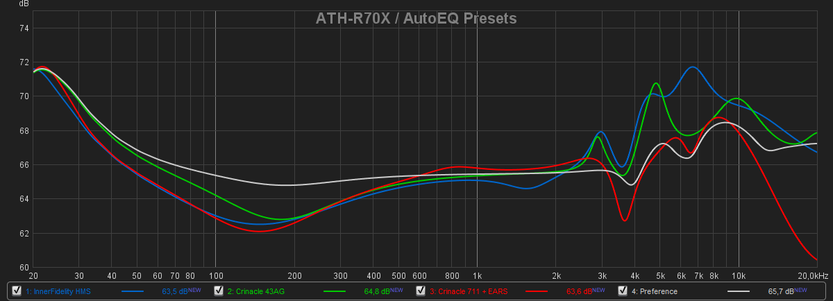 Hier mal alle drei EQ-Presets von Github. Dazu habe ich auch noch meine persönliche Präferenzkurve gesetzt, welche ich nach dem Loudness-Prinzip händisch per White Noise justiert habe.