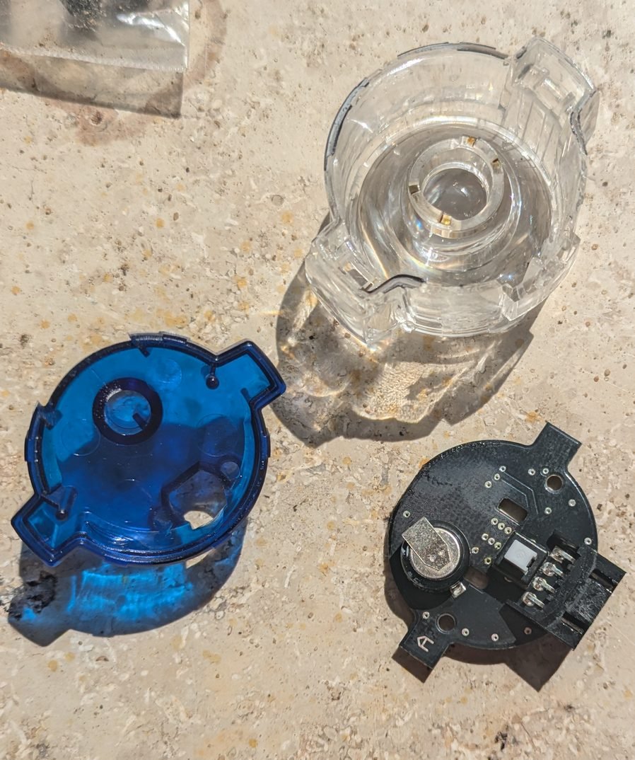 Es ist vermutlich wie bei der blueline Switch ein LED auf Platine verbaut. Davor sitzt ein Linse-Spiegel-Element in der transparenten Plexiglas-Kappe, welche in dem schwarzen Gehäuse verklebt oder verklammert ist. Der äußere Taster betätigt mechanisch einen auf der Platine sitzenden Taster, der eventuell defekt ist. Hier lässt sich nichts tauschen, es sei denn, man hat eine baugleiche Platine oder gleich eine “blueline 30“ zur Hand.