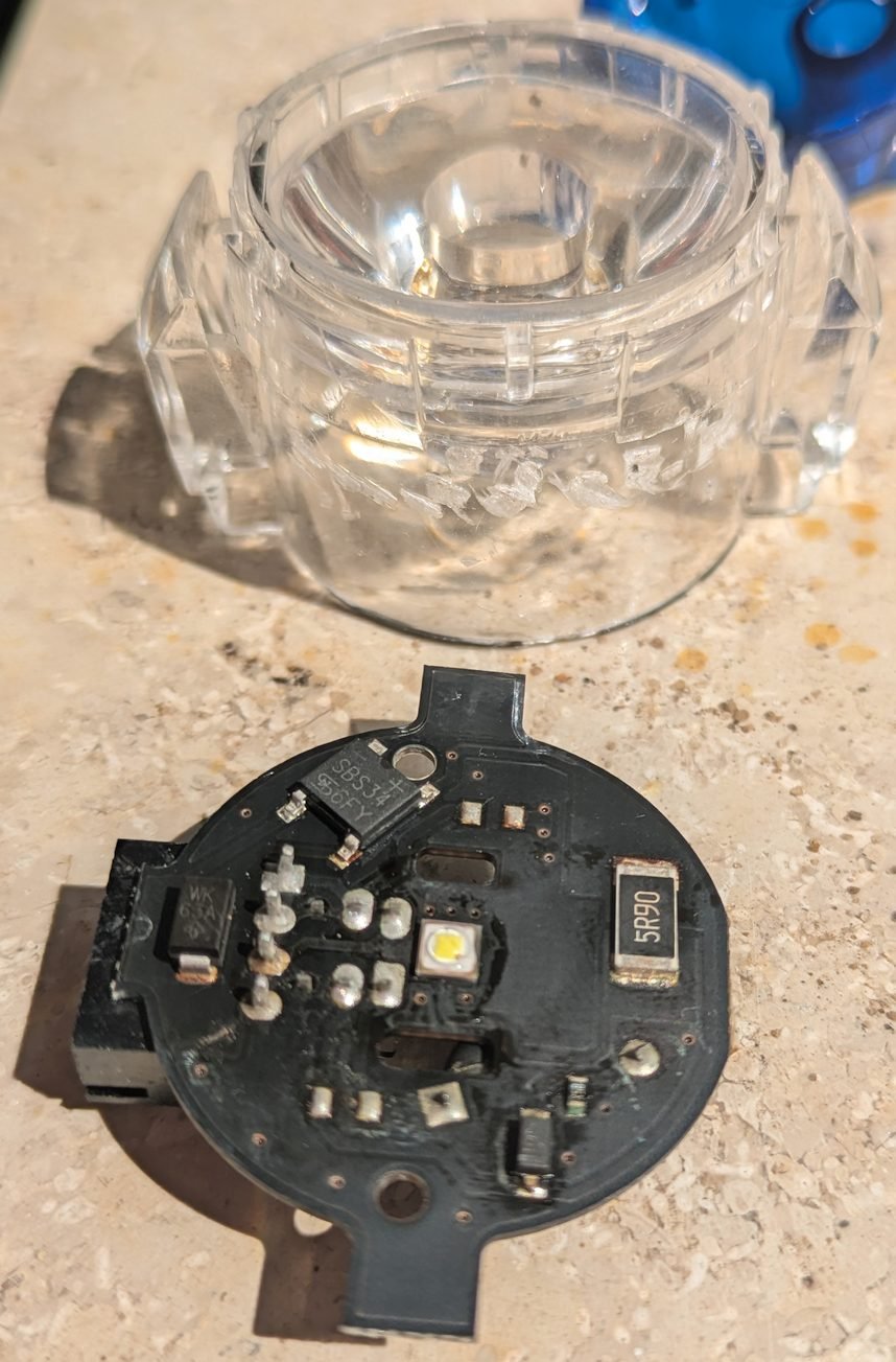 Den schwarzen Ring habe ich jetzt ab bekommen, aber das transparente Linse-Reflektor-Plastikteil bekomme ich nicht heraus. Ein Schraubenzieher ist schon leicht verbogen. Ich kann zwar unten, auf beiden Seiten, einen drunter schieben, und etwas hebeln, aber es löst sich (noch) nichts.
