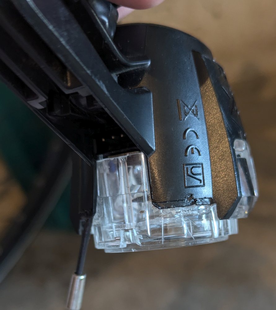 Ist'n Stecker mit den vier Kabeln dran. Jetzt komme ich wenigstens etwas besser ran, wenn der Stecker ab ist, obwohl's immer noch am Kabel baumelt.