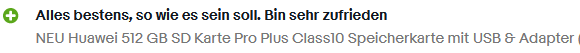 Und was diese Bewertung angeht, kann es nur ein Fake sein, denn wie gesagt, es gibt keine SD-Karten von Huawei.Nickel schrieb:Eine von mehreren Bewertungen die das Angebot betreffen.