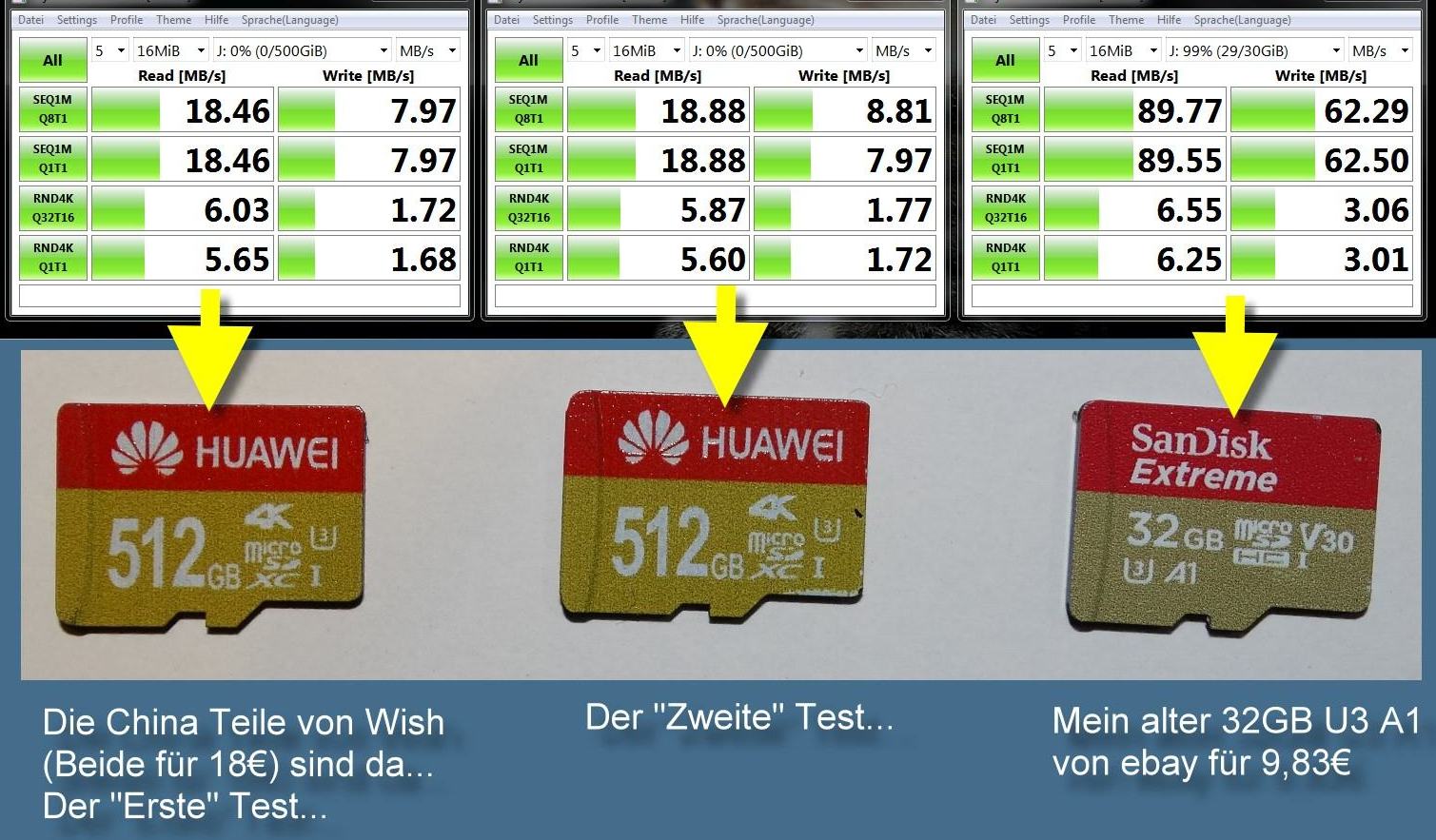 Auf Produktbewertungen kann man leider auch nicht immer viel geben und wer sagt, ich hätte mir die Bilder auch nicht aus den Fingern gesaugt? Wäre es Sandisk mit sehr langer SD Historie, wäre der Beweis für mich schwieriger zu belegen, aber ich habe es nicht nötig den Leuten Schaden zuzufügen und mir tun selbst die versenkten 18€ für einen guten Freund weh, der sich auf das Schnäppchen eingelassen hat. Da war aber auch die Wish Plattform gleich der Alarm für mich.