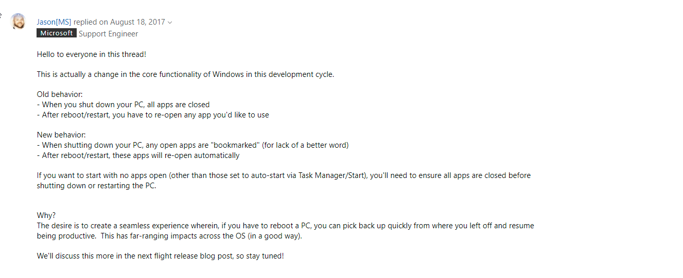 Seit dem Update öffnet Windows wieder einen Teil der Anwendungen die beim Herunterfahren geöffnet wurden, leider nicht genau so wie sie geschlossen wurden. Beim Browser sind bereits geschlossene Tabs wieder geöffnet oder eine alte Playlist in Spotify. Darum hätte ich gerne die Option deaktiviert.