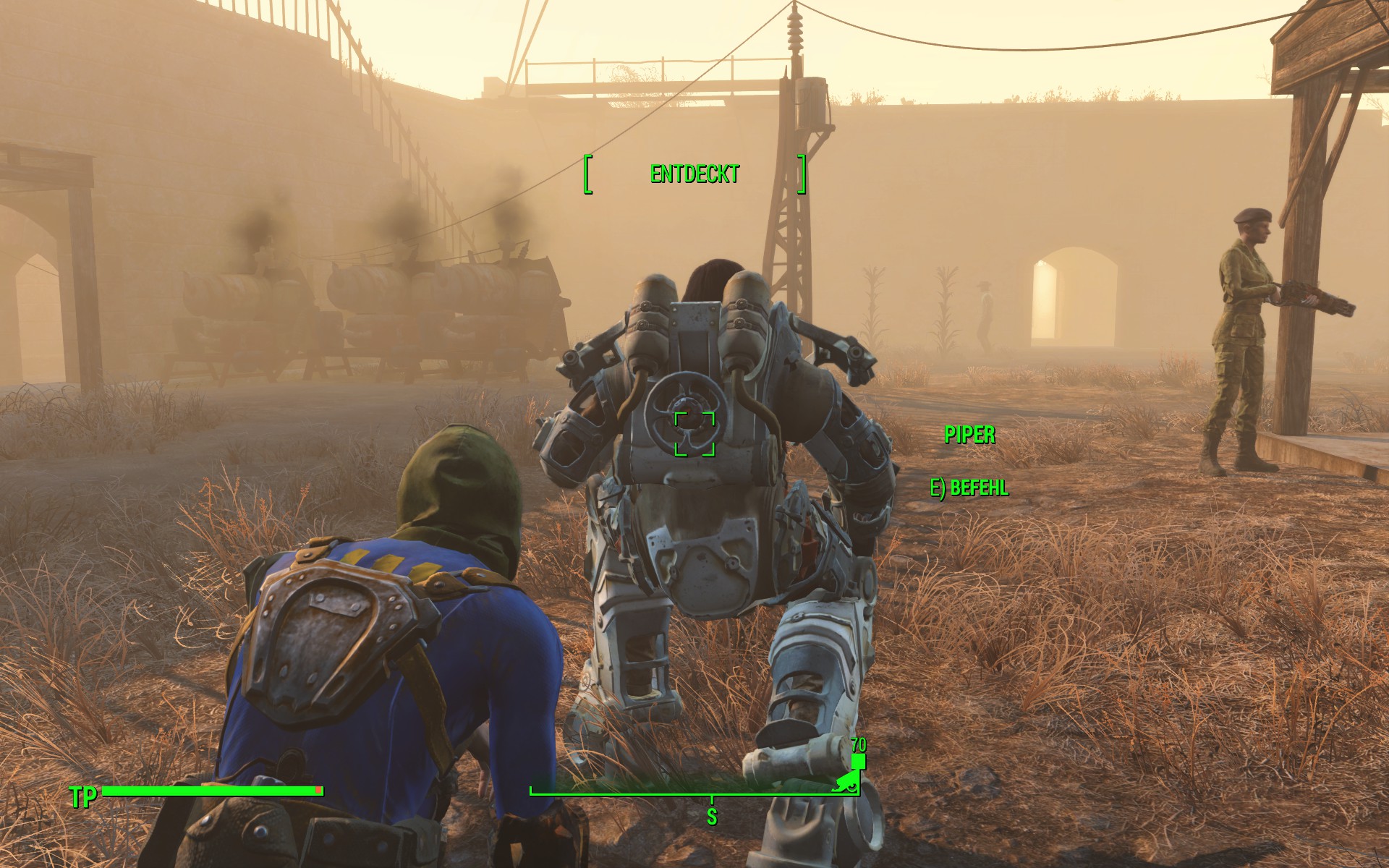 Es hat knapp 20 Minuten gedauert, bis ich gemerkt hatte, dass die Rüstung kein Saft mehr hat. Dnach ging es zu Fuß weiter. Nachdem ich einen Kern gefunden hatte, habe ich die Rüstung nach Sanctuary gebracht und erst mal da stehen lassen. Habe sogar schon 3 Teile auf die B Variante aufgerüstet.