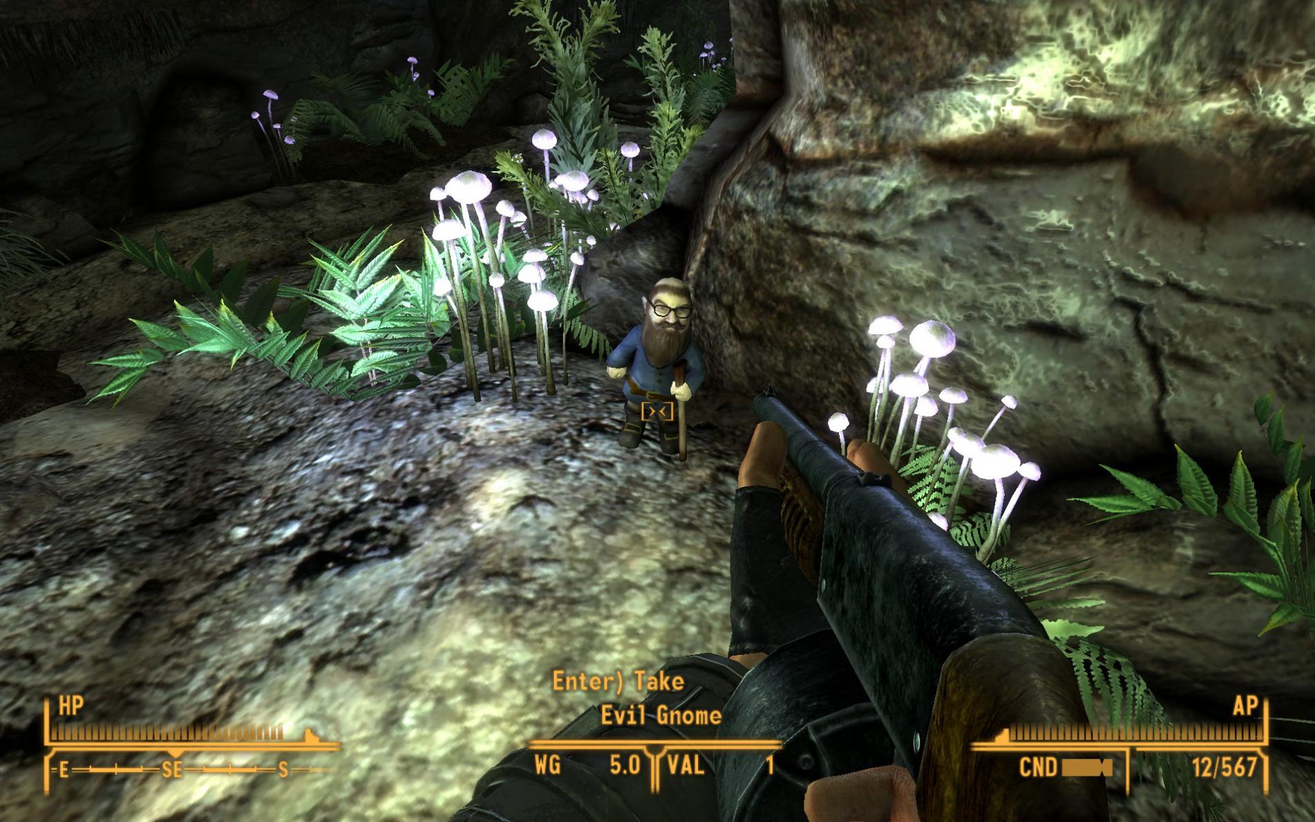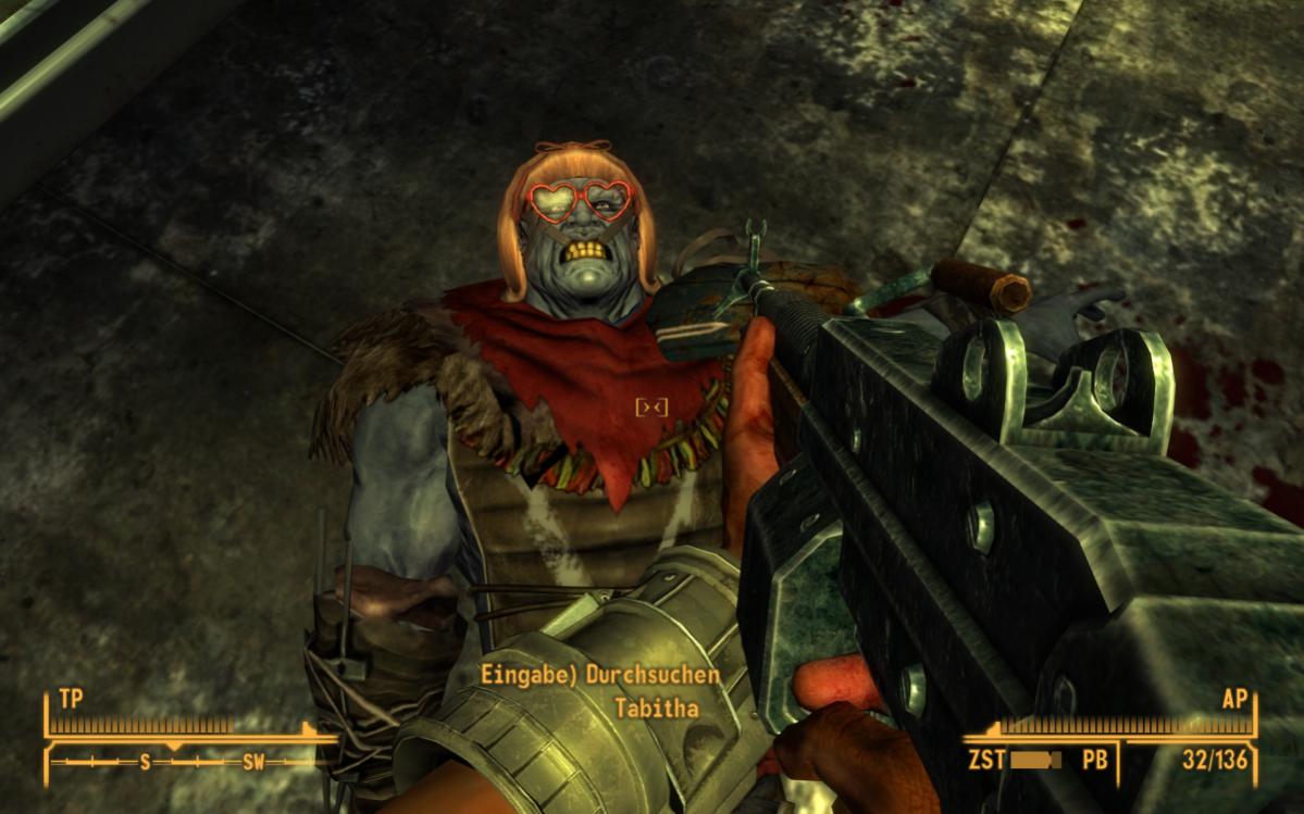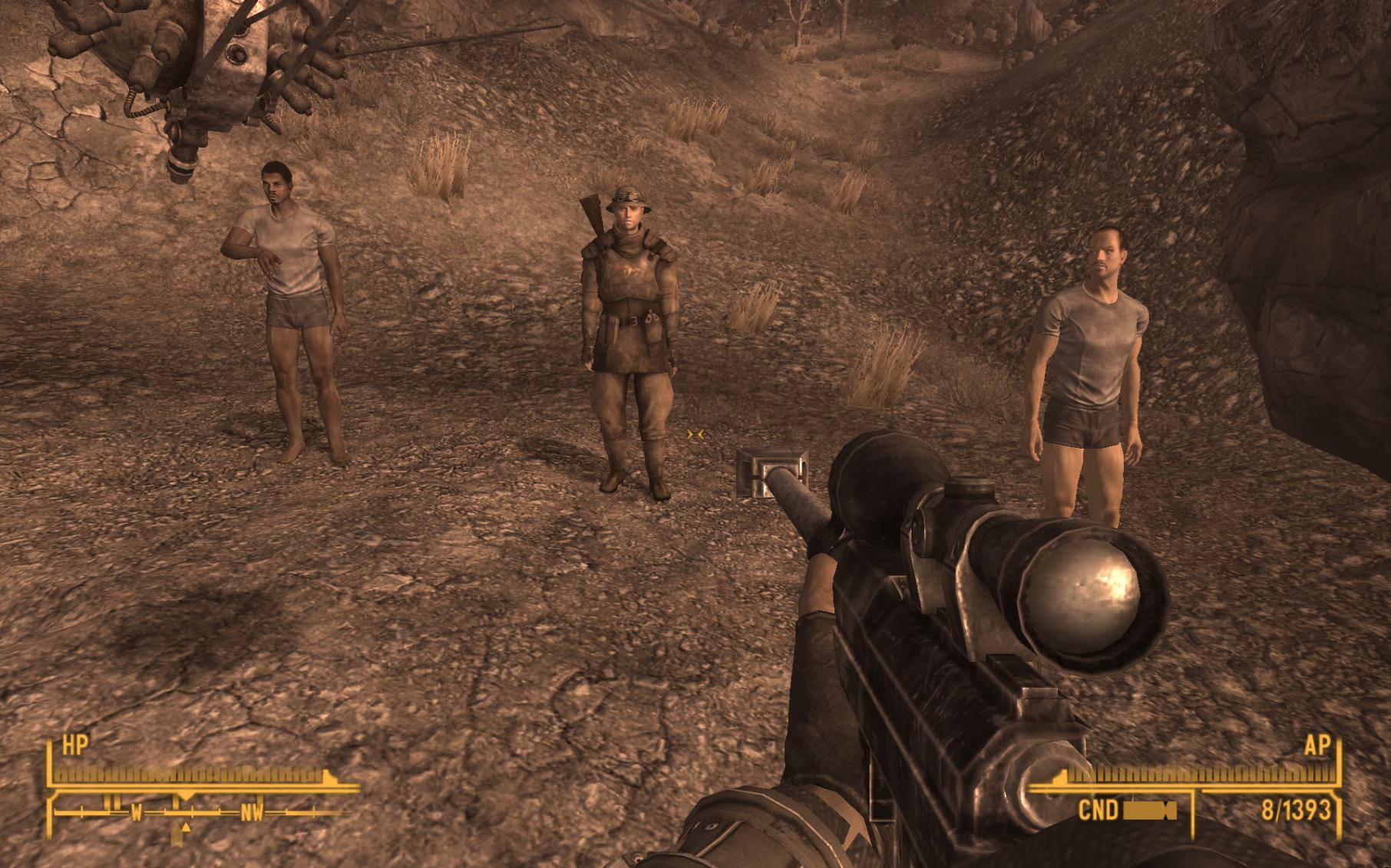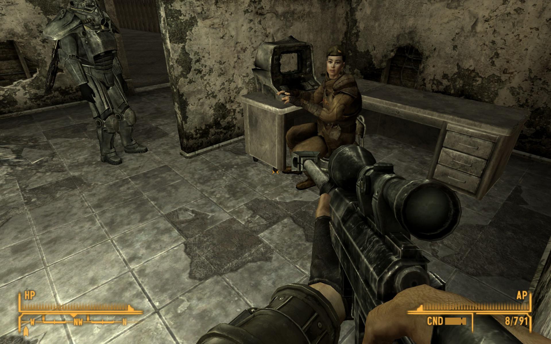 NCR Soldaten in Unterwäsche, denen ich helfen soll Nelson einzunehmen. Ein BOS Paladin im Boden oder wenn NPCs an ausgebrannten Computern sitzen und in der Luft Tippübungen machen.