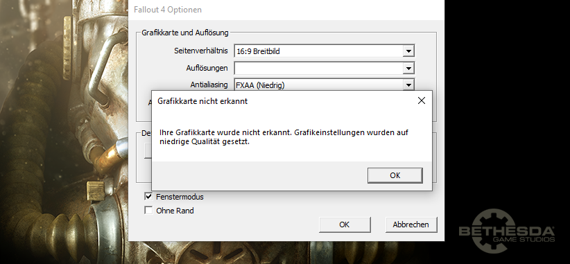 hab mir eben Fallout 4 runtergeladen und wollte starten. Da bekam ich die Meldung das die Grafikkarte nicht anerkannt wird und das dass Spiel auf die niedrigsten Einstellungen zurĂŒckgesetzt wurden ist đ. Hat jemand damit Erfahrung und weiĂ wie ich das beheben kann?