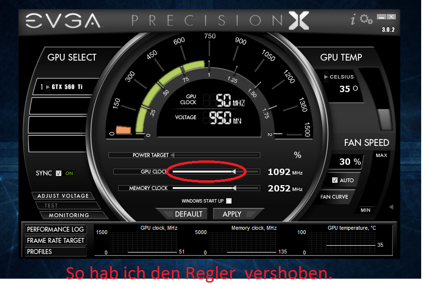 Ich wollte mal wieder aus meiner Gtx 560 ti ein bisschen mehr Leistung für die erlesenen Spiele rauskitzeln.Lade ich mir also EVGA precision X herunter,und schraube erstmal den Coretakt auf gleiche Höhe wie die des Memory Taktes.