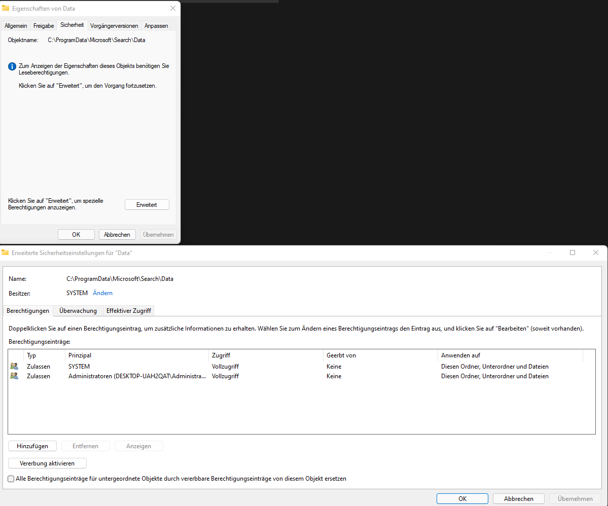 - Manuell die Berechtigungen für den Windows Search Ordner zu ändern. Ich habe den Windows Search Dienst gestoppt, den aktuellen Benutzer eingetragen und die Änderungen übernommen. Sobald ich den Troubleshooter erneut ausführe, werden die Rechte zurückgesetzt und der aktuelle Benutzer wieder ausgesperrt.