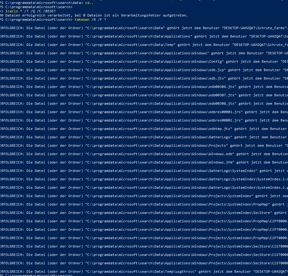 - Über Konsole versucht per icacls die Ordner Brechtigungen zurückzusetzen und mit takedown alle Dateien zu übernehmen. War angeblich erfolgreich, aber ich kriege immer noch besagten Fehler beim Troubleshooter.