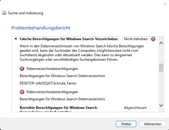 Das System wurde frisch installiert. Ich habe das letzte Update in Verdacht. Wie schaut es bei euch aus, wenn ihr die Fehlerdiagnose für "Windows Search" im erweierteten Modus ausführt ?
