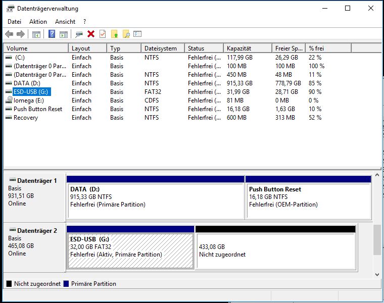 Jetzt wird mir die Festplatte als Windows Boot-Drive angezeigt (Kapazität nur noch ein paar GB)