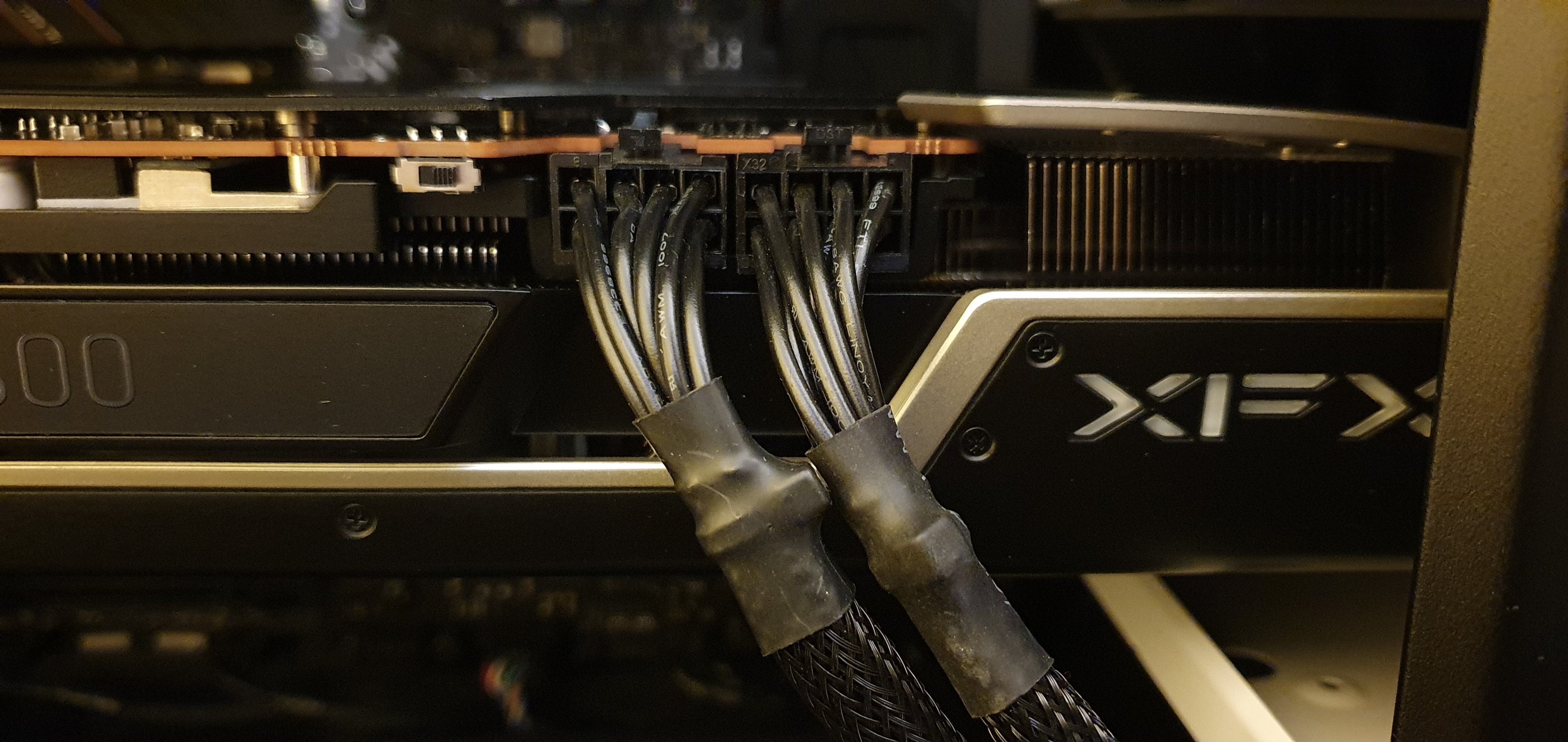 Als ich gestern meine Grafikkarte mit dem Netzteil verbinden wollte, musste ich leider feststellen, dass mir anscheinend zwei falsche (?) Kabel geliefert wurden. Diese tragen die Beschriftung "VGA1" bzw "VGA2". Diese Unterscheiden sich durch einen PIN von den standardmäßigen PCIe Steckern und passen somit nicht auf die Grafikkarte. (siehe Foto)