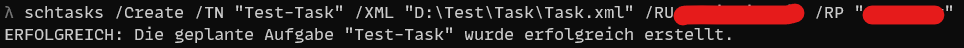 schtasks /Create /TN "TEST\Malware-Aktualisierung" /XML "D:\PRIVAT\Windows + Co\gesicherte Dateien\Windows\Tasks\TEST\Malware-Aktualisierung.xml" /RU %USER% /RP %PASSWORD%