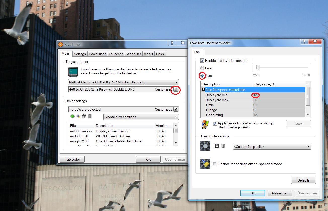 Stell das einfach so mal ungefähr ein, wie ich es gemacht habe im RivaTuner. Ich bin mir selbst nicht über die Bedeutung aller Werte im Klaren. Aber so läuft die Karte bei mir gut und leise und regelt sich bei Spielen selbstständig hoch.