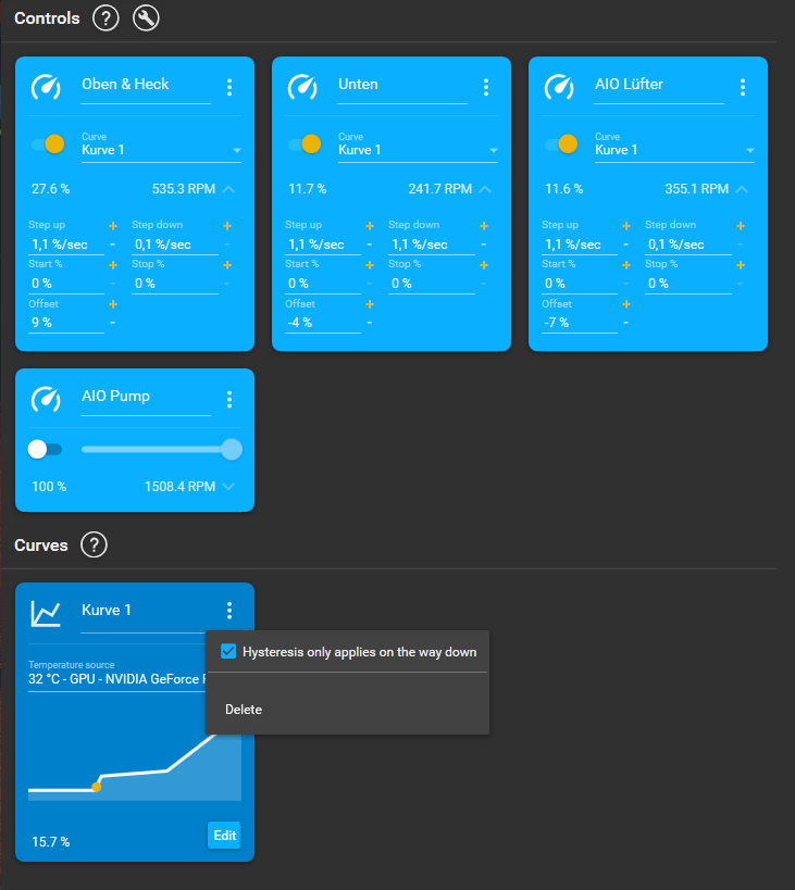 2. Wie eingangs schon erwähnt, sind die Lüfter der Grafikkarte am externen Lüfteranschluss der Grafikkarte verbaut. Auch diese erkennt FanControl nicht (GPU Tweak aber schon). Kann man das auch manuell einstellen? Wenn ja, wie?