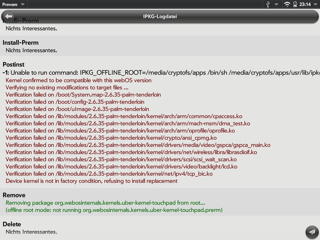 Anmerkung: Preware ist seit ein paar Tagen neu organisiert. Infos zu Alpha und Beta Feeds bitte folgendem Link entnehmen: http://www.webos-internals.org/wiki/Testing_Feeds (oben auf die German-Flagge klicken, dann kommt der Text und Erläuterung auch auf Deutsch. Damit könnt ihr euch auch neu Kernels etc falshen.