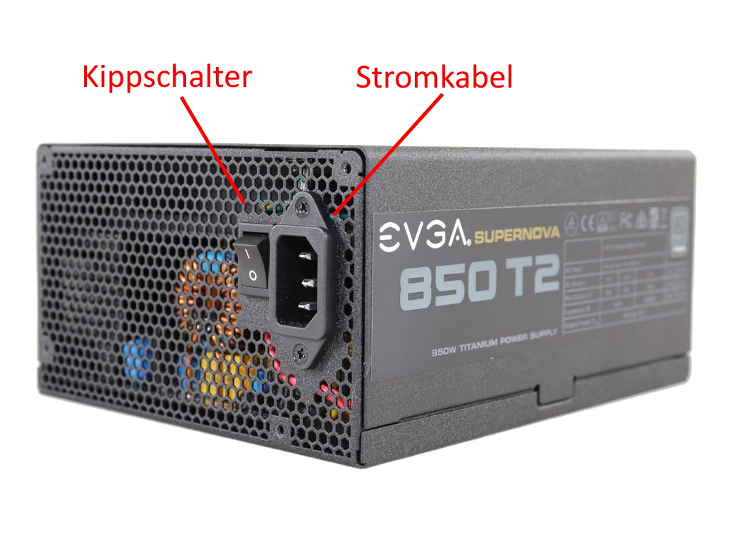 Danach fahrt ihr den Rechner runter, schaltet das Netzteil per Kippschalter aus und fasst den Rechner am Gehäuse an, solange dieser noch eingestöpselt ist. Damit erdet ihr euch und sorgt dafür, dass möglichst wenig statische Ladung vorhanden ist. Alternativ könnt ihr euch einen Heizradiator anfassen. Nun entfernt ihr das Stromkabel.