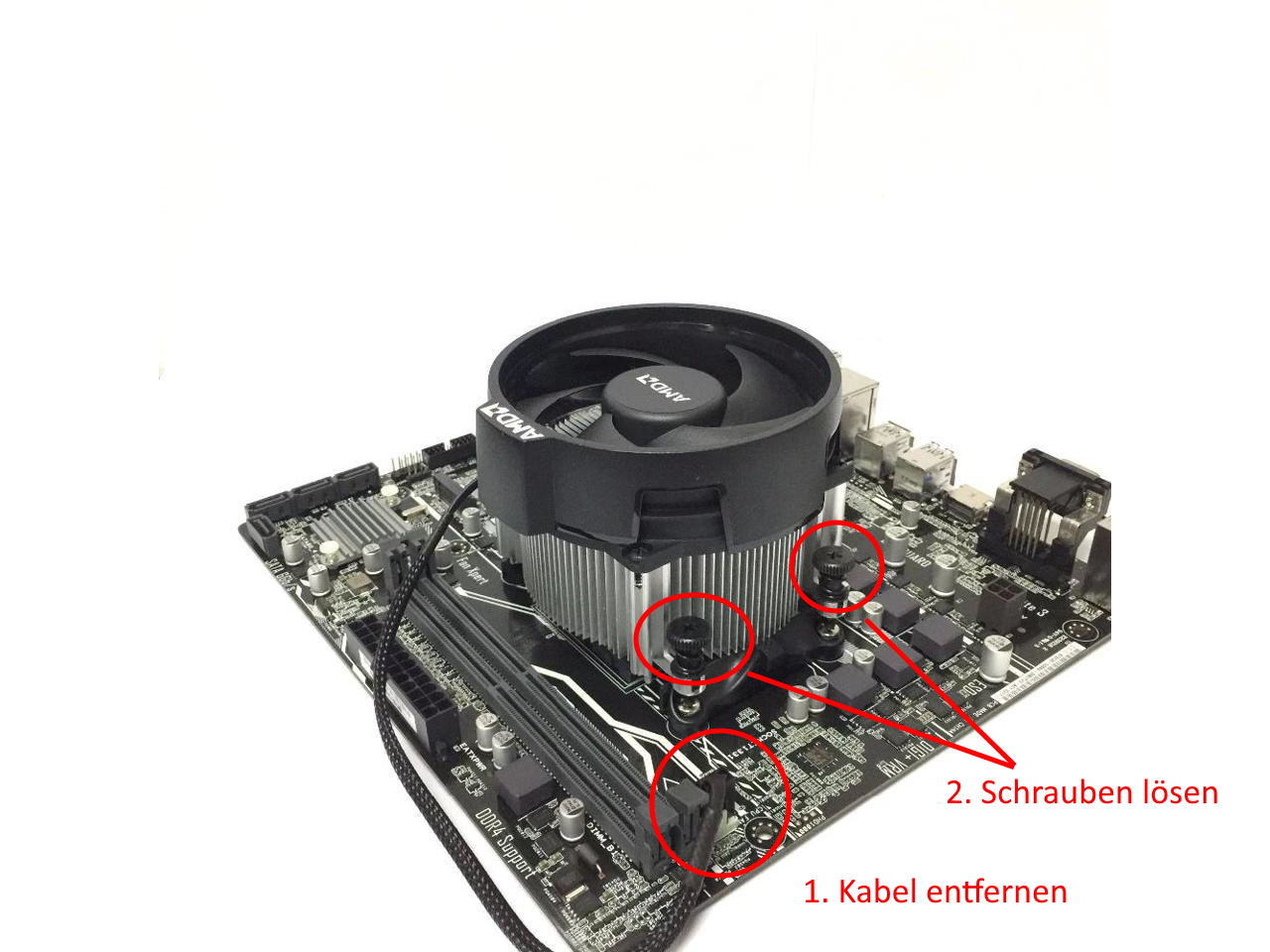 Als nächstes legt ihr euren PC seitlich hin, öffnet das Seitenteil eures Rechners, löst das kleine Lüfterkabel welches mit dem Mainboard verbunden ist und löst danach die 4 Schrauben um den Kühlkörper zu lösen. Jetzt solltet ihr durch einfaches Anheben den Kühlkörper von der CPU lösen können - je nach Wärmeleitpaste sind auch ein paar leichte/sanfte Drehbewegungen nötig.