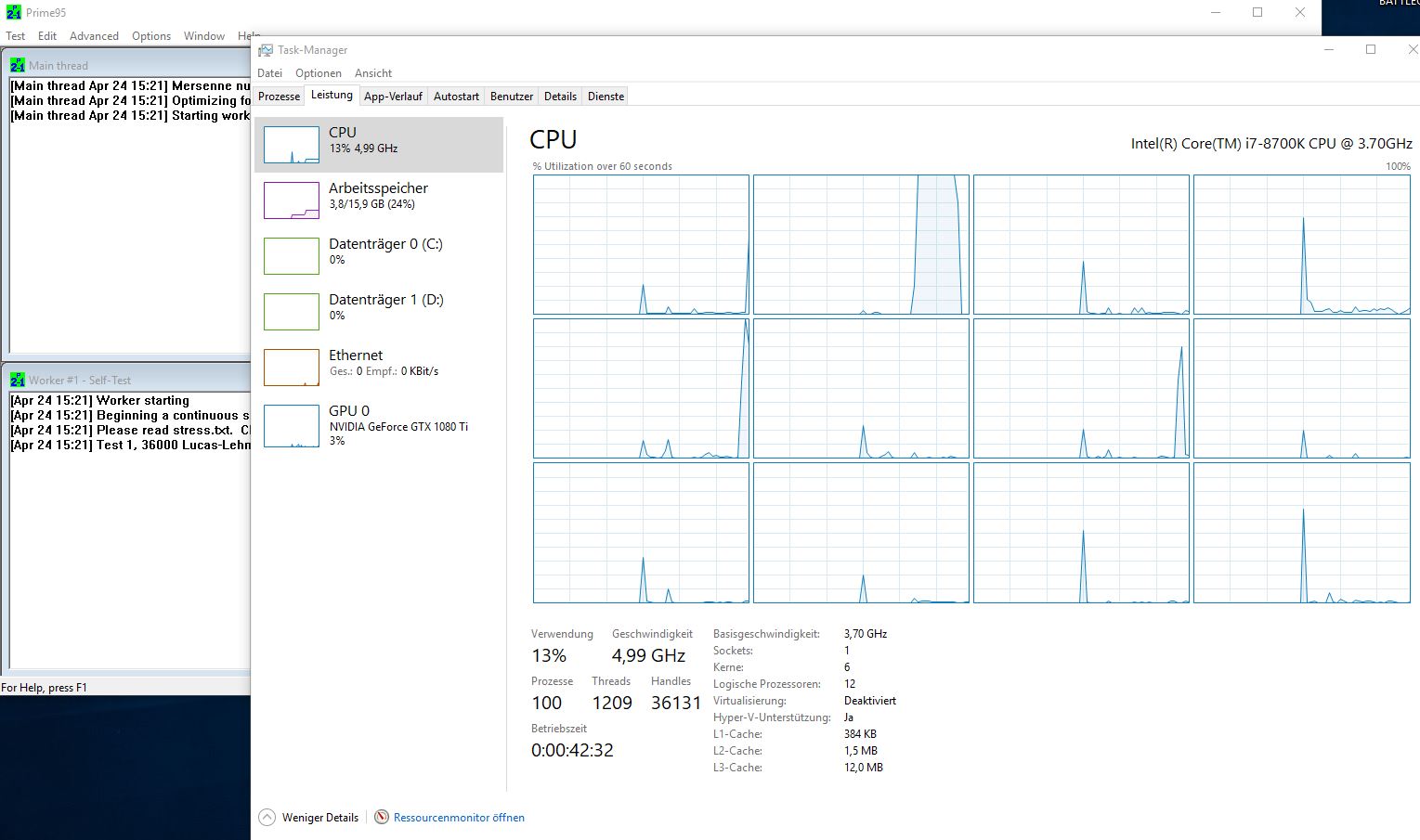 "auffällig" wäre, prime 95 mit einem Kern Last habe ich 100% CPU LAST im task Manager (würde ich aber ab 15uhr nochmal prüfen)