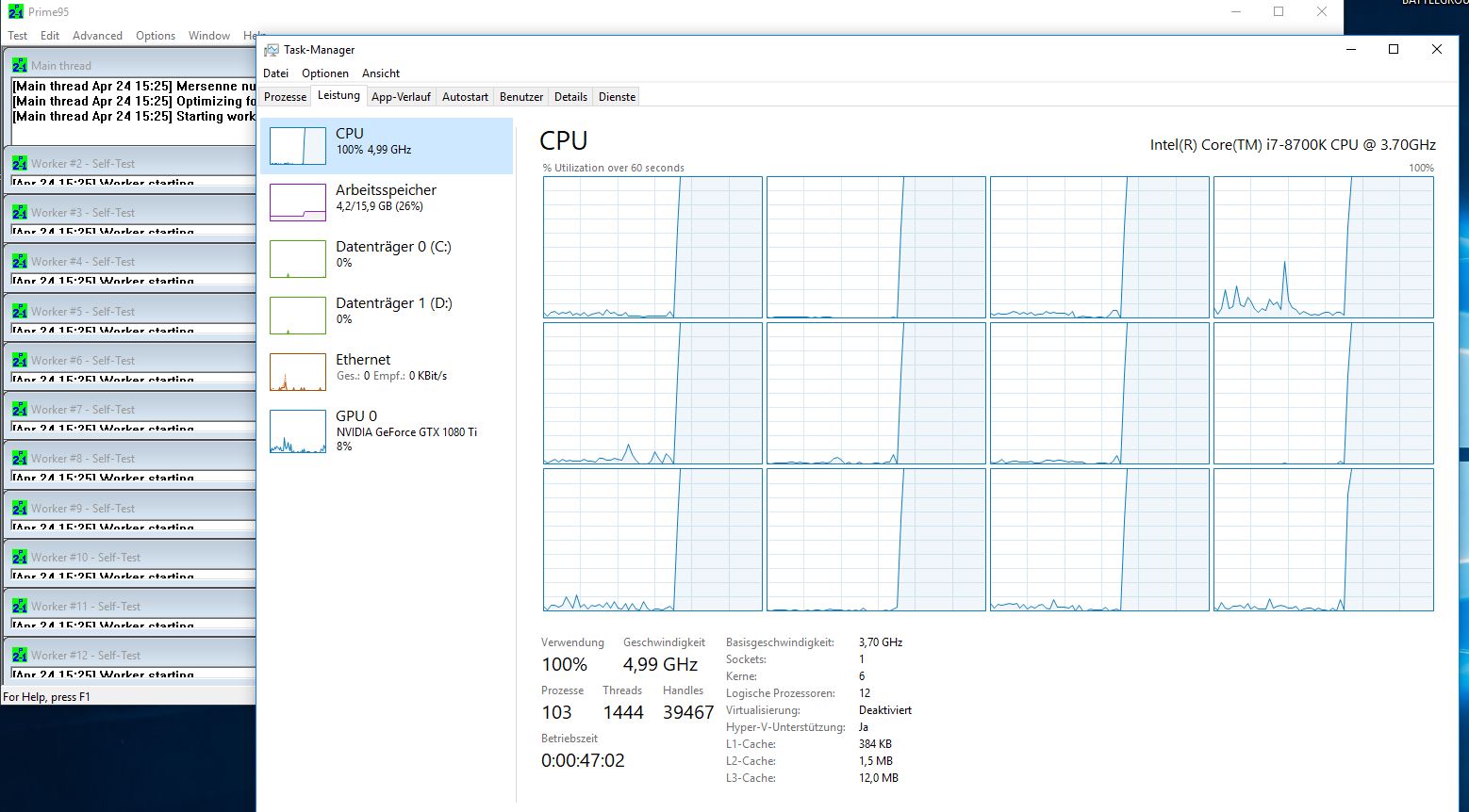 - i7 8700K (momentan auf 4,99GhZ aber zum Testen auch mit Standard Takt)