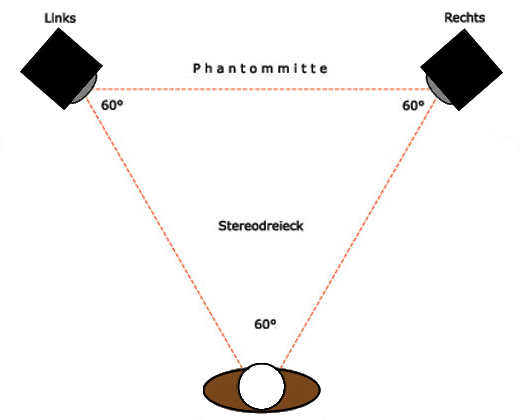Hierbei handelt es sich um eine allgemein anerkannte Form der Lautsprecheraufstellung im Stereobetrieb, sie ist aber auch im Merhrkanalbetrieb nützlich (s.u.). Im Idealfall sind die Lautsprecher und die Sitzposition des Zuhörers wie im Bild unten angeordnet. Falls dies aber so nicht möglich ist, so sollten die Lautsprecher in etwa gleich weit vom Zuhörer positioniert werden (halt anstelle eines gleichseitigen in einem gleichschenkligen Dreieck).