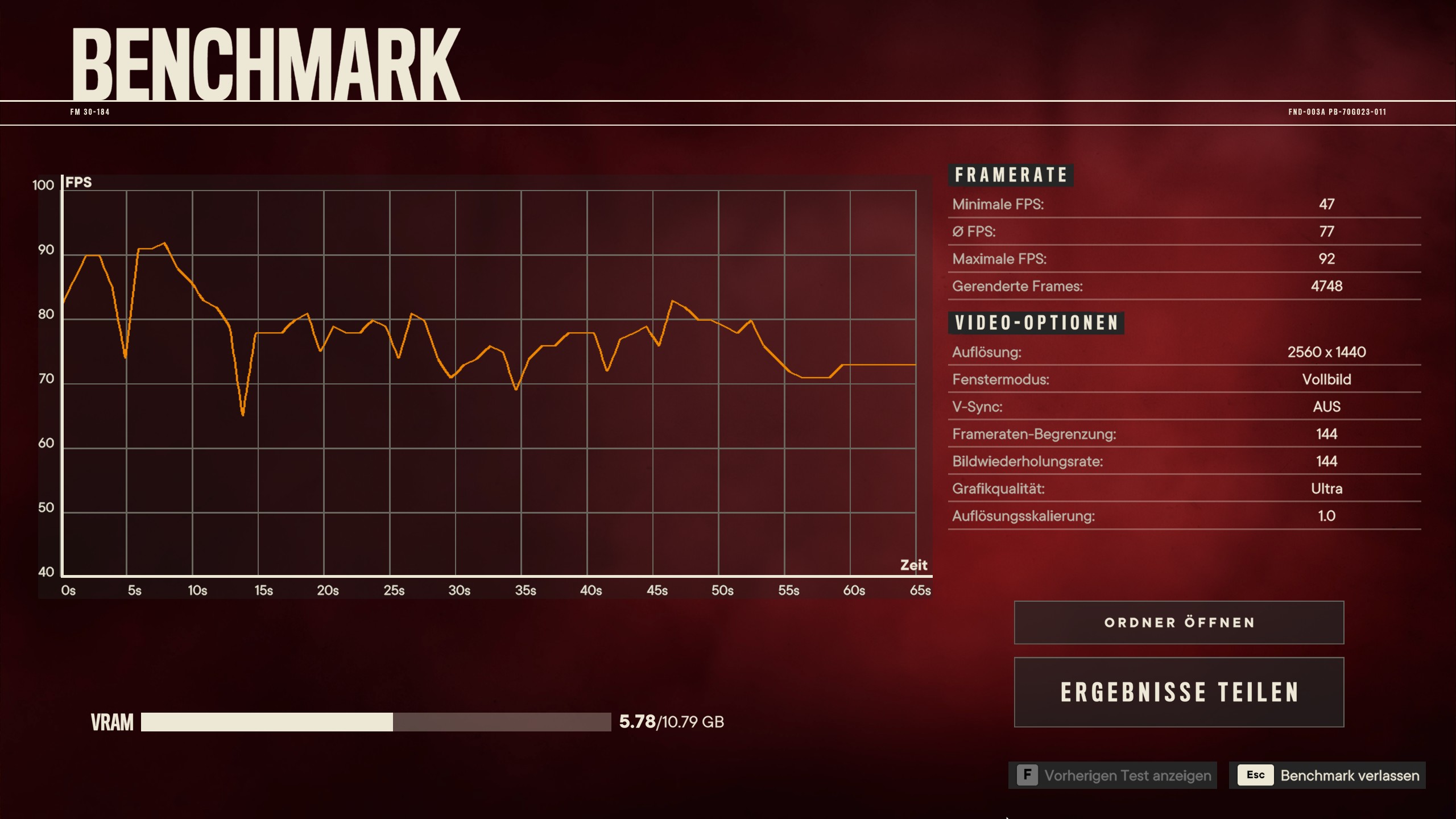 Komische Speicherauslastung?! Im internen Benchmark bei 1440p + Ultra + DXR FX/Shadow etc + HD Texturen habe ich im Durchschnitt 77 FPS und das bei max 5.8GB VRAM Auslastung. Nach 1h Stunde Spielzeit sind max 8.2GB im VRAM.