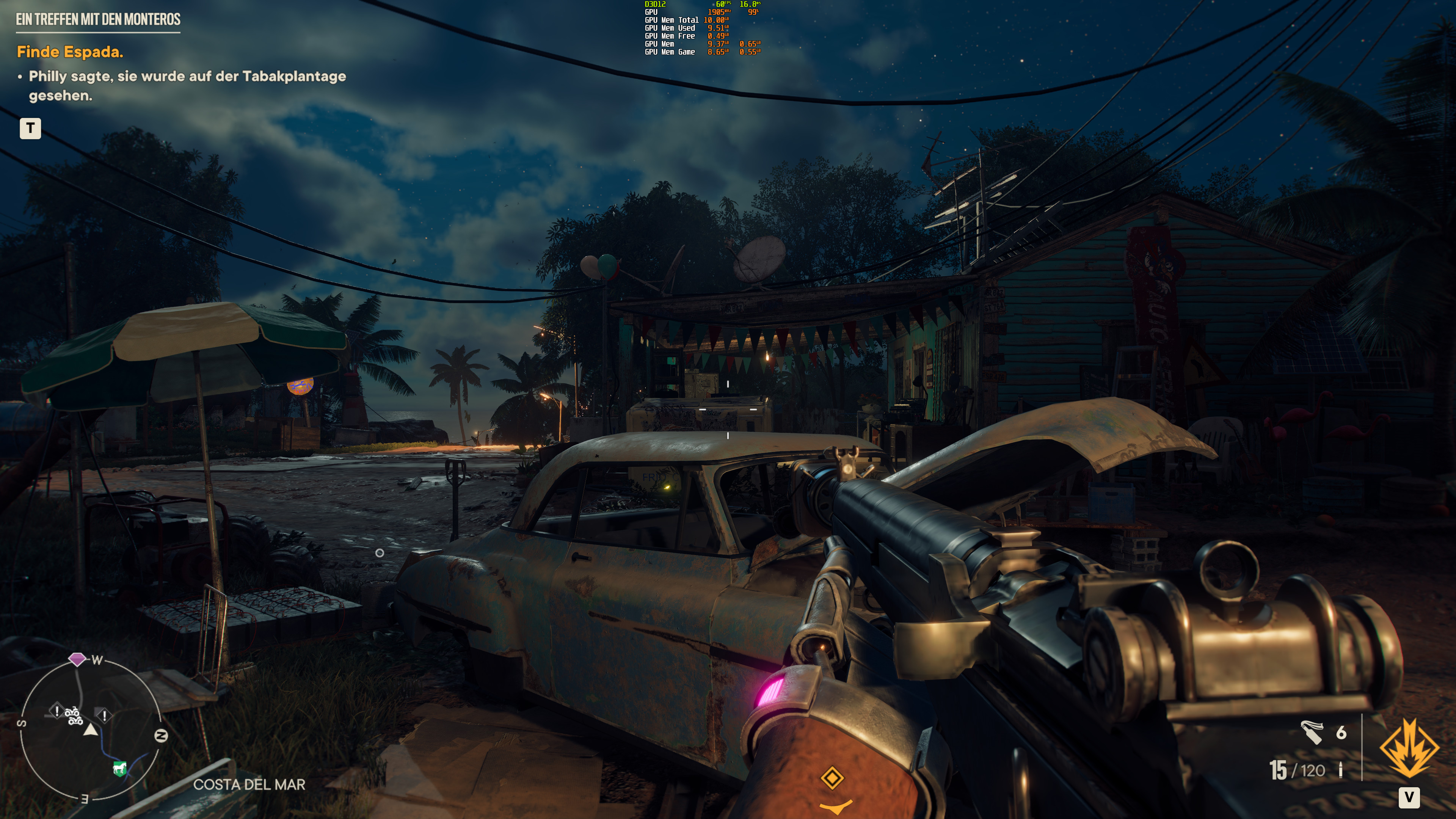 Manchmal startet das Spiel auch noch flüssig, ruckelt dann aber immer mal wieder ab und zu und lässt immer mal wieder auch Texturen aus (siehe Screenshot auf der Waffe). Dasselbe passiert auch bei abgeschaltetem Raytracing, nur weniger extrem und weniger oft. Aber sicher ist man davor nicht. Ab 12 GB passiert das nicht mehr.