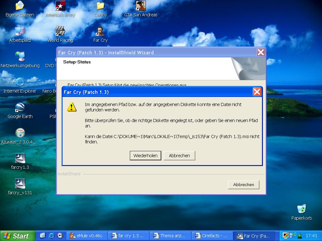 1.3 gestartet und dann kommt immer diese Meldung (im Anhang) Egal ob ich den Patch vom Desktop oder FarCry Verzeichnis starte. Habe den Patch auch noch auf ner CD gehabt und bei dem kommt auch immer die Meldung.