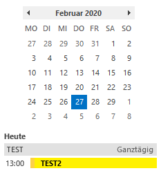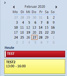 Dies tritt auch nur bei ganztägigen Terminen auf - begrenzte Termine, z.B. von 13:00Uhr bis 16:00Uhr (siehe Screenshot - gelber Termin), werden auch in der Übersicht korrekt eingefärbt.
