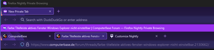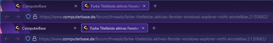 Zumindest schaffe ich es nicht, die Farbe der Titelleiste von Fenstern des Windows Explorers so einzustellen, dass das aktive z.B. dunkler ist. Wenn ich die betreffenden Einstellungen mache, verändert sich zwar sofort die Rahmenfarbe, aber nicht die Titeleiste, so wie bei anderen Fenstertypen. Es betrifft offenbar auch Fenster des Firefox. Egal ob Vordergrund oder Hintergrund, die Titelleiste ist immer gleich. Alle anderen bisher von mir verwendeten Windows- oder Programmfenster dagegen funktionieren wie gewünscht und geänderte Einstellungen werden sofort sichtbar.