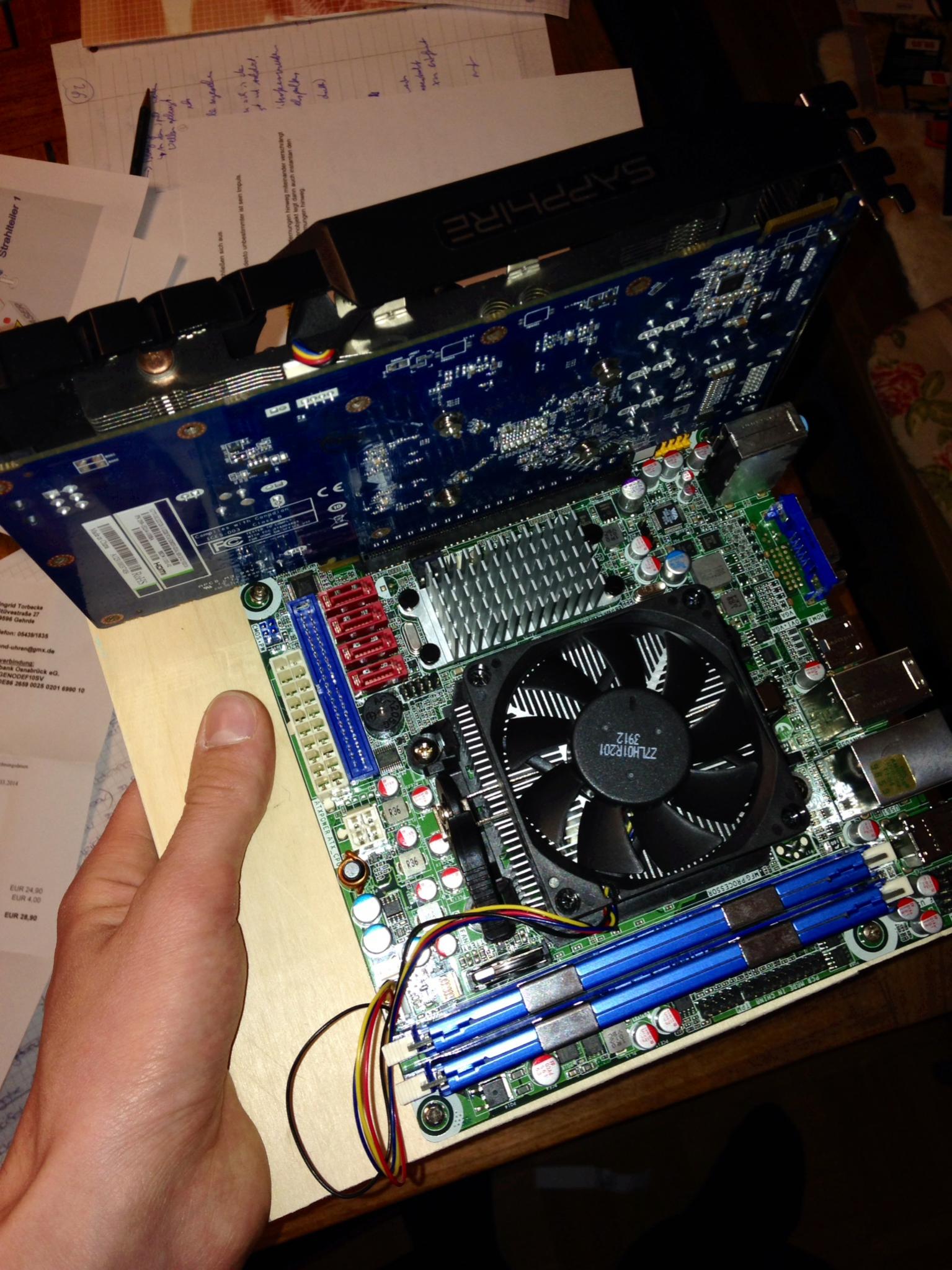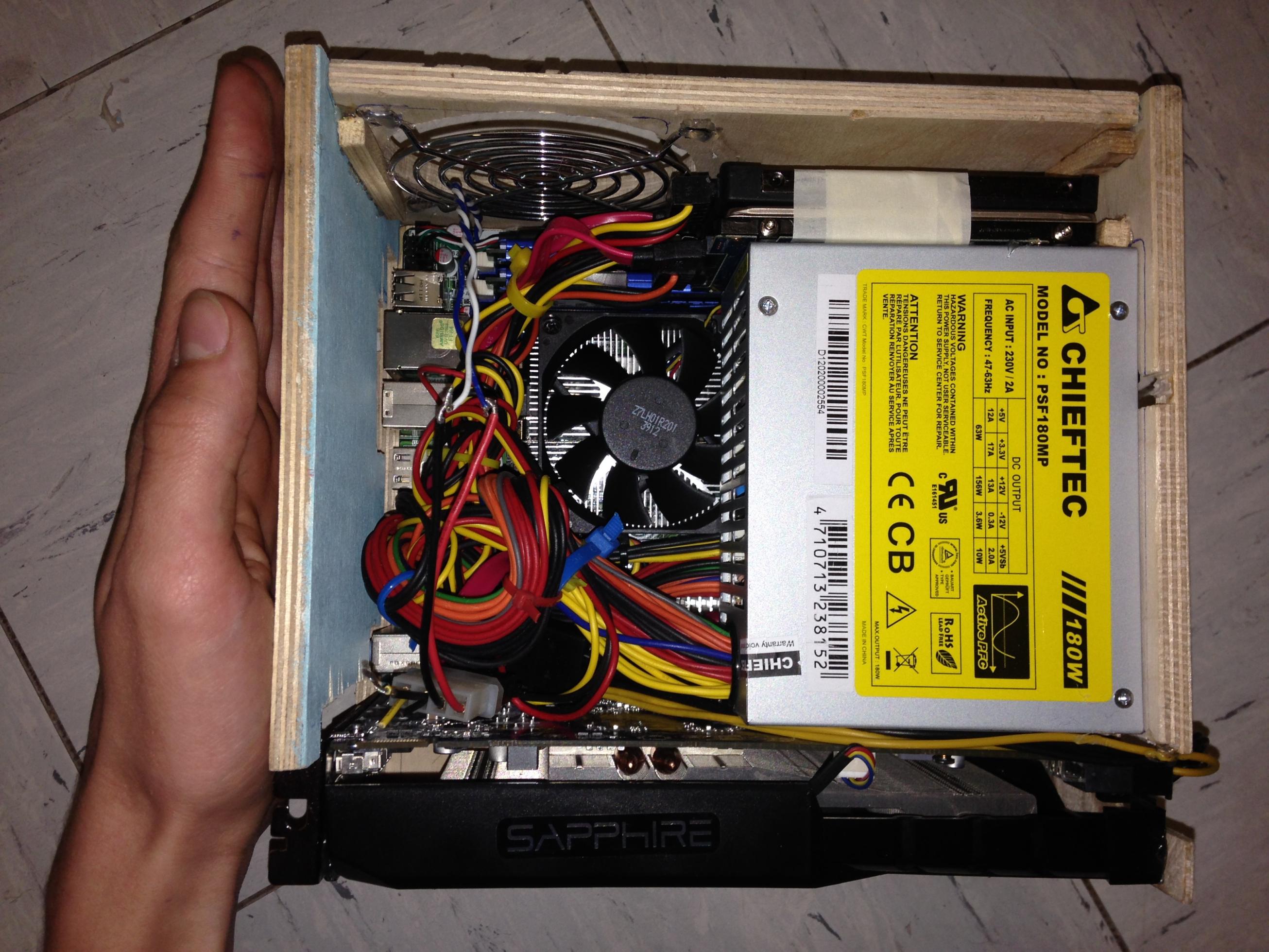 Ich wollte euch mal mein neues, kleines Projekt vorstellen: Einen mini-gamer-pc, der aktuelle Spiele in hohen Grafikeinstellungen ruckelfrei spielen kann und problemlos mit einer Hand gehalten werden kann. Das komplette Gehäuse ist kleiner als ein Din A4 Blatt. Auch unter Vollast kam es trotz des schwachen Netzteils nicht zu Problemen. Auch die Wärmeentwicklung war bisher kein Problem.
