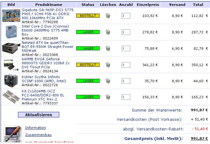 Gehäuse, Netzteil, Audigy & Brenner und DVD Laufwerk (beide IDE) behalte ich aus meinem Alten System.