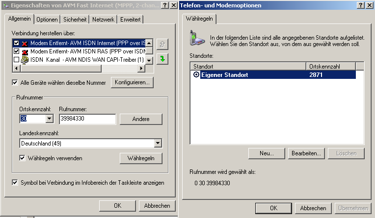 - Wenn ich das LAN Kabel ziehe und im Netzwerk eine Wählverbindung anlege (Rufnummer: 0192-658, Name+Kennwort: MSN) funktioniert das ebenfalls.