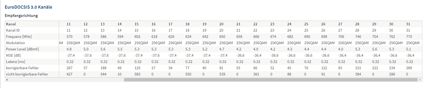 schon seit langem habe ich auf meiner FB 6591 mit Gigabit-Anschluss auf jedem zweiten Kanal ca. 24-48h nach selbst eingeleitetem Neustart eine mittlere dreistellige Anzahl an nicht korrigierbaren Fehlern, aber auch erst ab den höheren Frequenzen ab Kanal 8 etwa.
