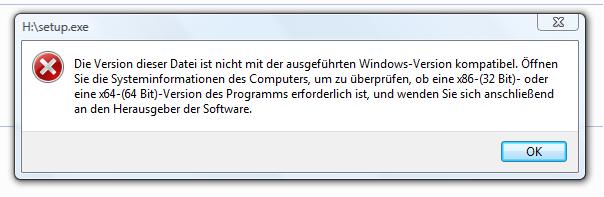 "Die Version dieser Datei ist mit der ausgeführten Windows-Version inkompatibel...." (Die komplette Meldung ist angehängt)