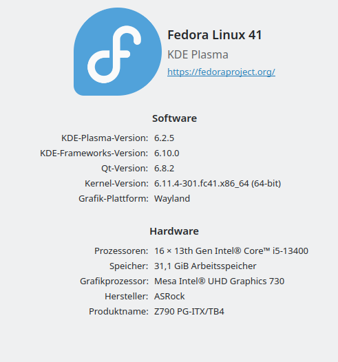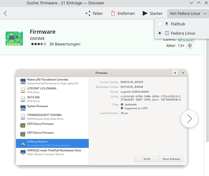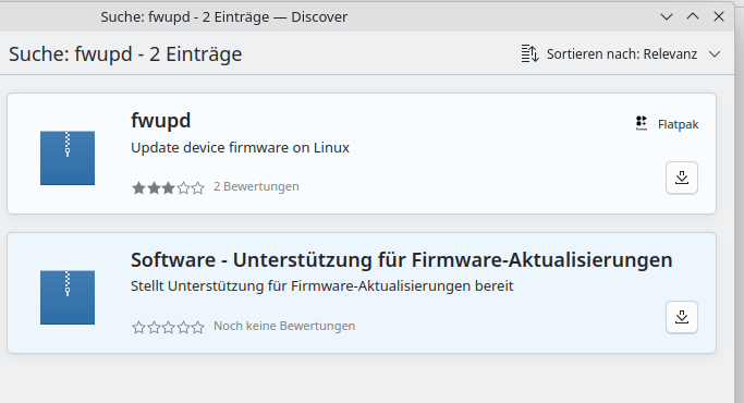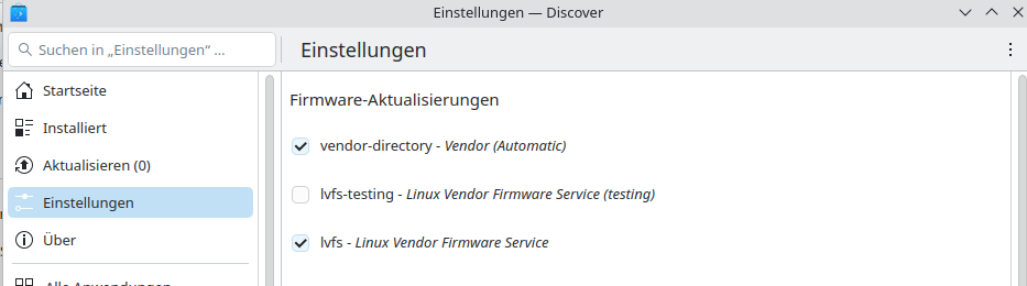Updates vom System, Programmen und Firmware werden automatisch gemeldet über "Discover". Dort ist wohl auch LVFS intigriert, sodass fwupd wohl auch dabei ist. "fwupd" über Discover (Flathub) konnte ich nicht installieren (ging erst nicht, und startete auch nie). "Gnome-Firmware" (über Discover installiert) zeigt mir an, dass alles aktuell sei.