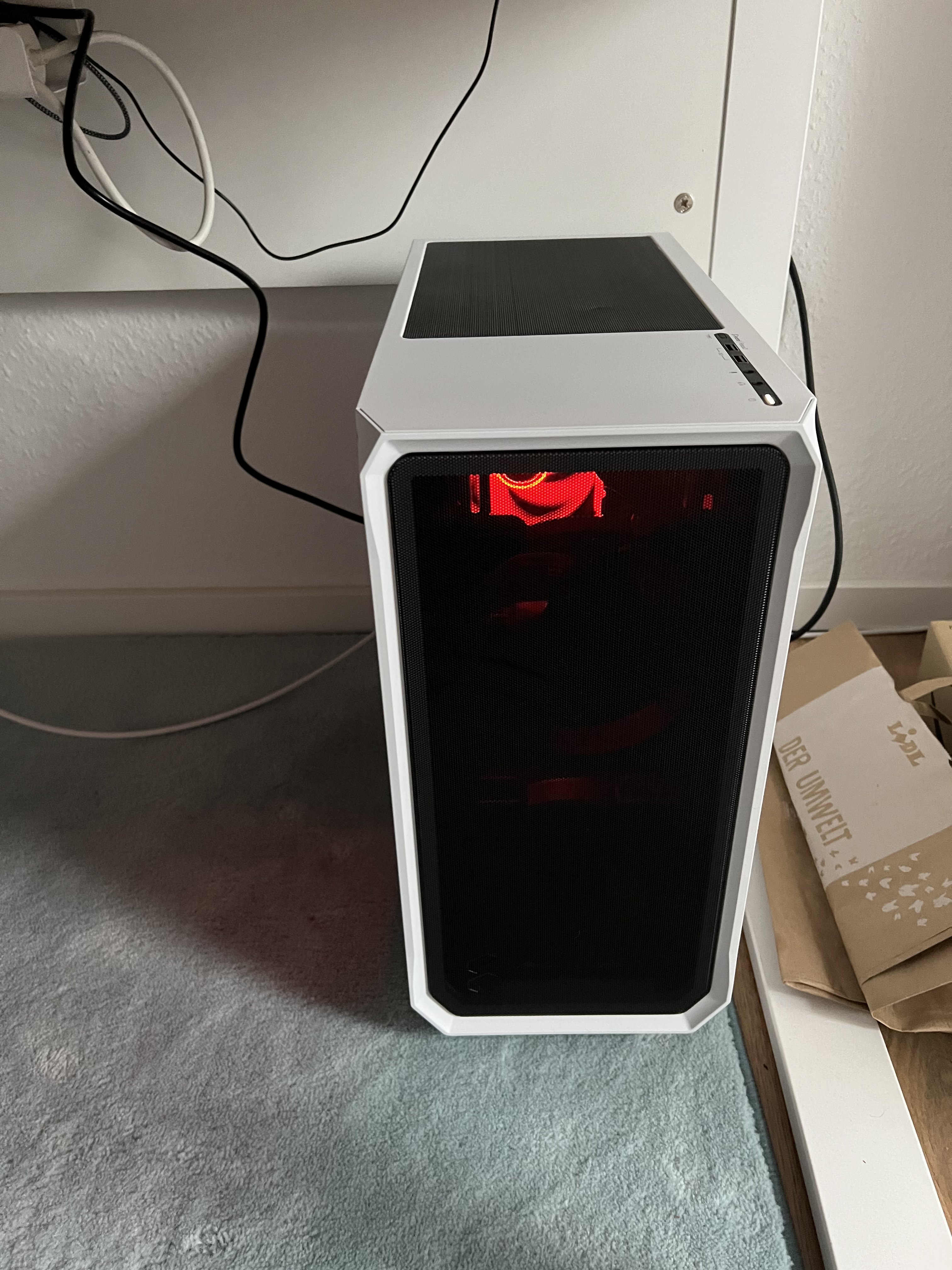 Minimales RGB: schwarzes oder schwarz/weißes Case mit etwas roten Glimmern durchs Fenster (quasi Star-Wars Sith-Style): Also RGB Ram, sonst alles eher schwarz.