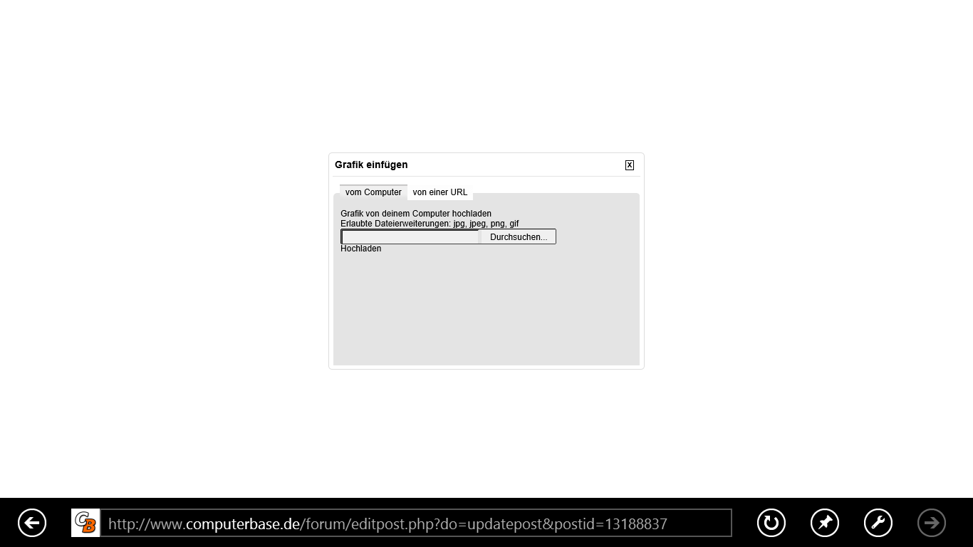 Probier mal bitte den Button "Anhänge" anstatt "Grafik einfügen" aus. Der funktioniert in IE 10.KainerM schrieb:So wie im Anhang sieht im übrigen der "Grafik einfügen" Dialog aus, wenn ich ihn unter Windows RT aufrufe. Die Schaltfläche "Hochladen" bewegt sich zwar, es passiert aber nichts!