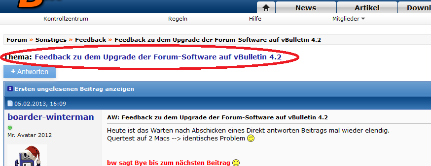 Ich denke die richtige Lösung wäre es, den Link zum ersten ungelesenen Beitrag größer auszugeben anstatt eine nicht ganz unproblematische Konfigurationsmöglichkeit einzubauen. Denn man will ja auch mit dem Tablet durchaus mal auf die erste Seite eines Themas gelangen. Das wäre also eine ziemliche Krücke und noch dazu nicht einfach umzusetzen. Da sollten wir denke ich eher darüber nachdenken, wie im Mobile-Layout den Link zum ersten ungelesenen Beitrag größer auszugeben (und stattdessen z.B. auf den Link zum letzten Beitrag zu verzichten, der zumindest IMO ziemlich nutzlos ist).boarder-winterman schrieb:Könntet ihr irgendwo im Kontrollzentrum die Funktion einbauen beim Öffnen eines Threads automatisch zum ersten ungelesenen Beitrag zu springen?