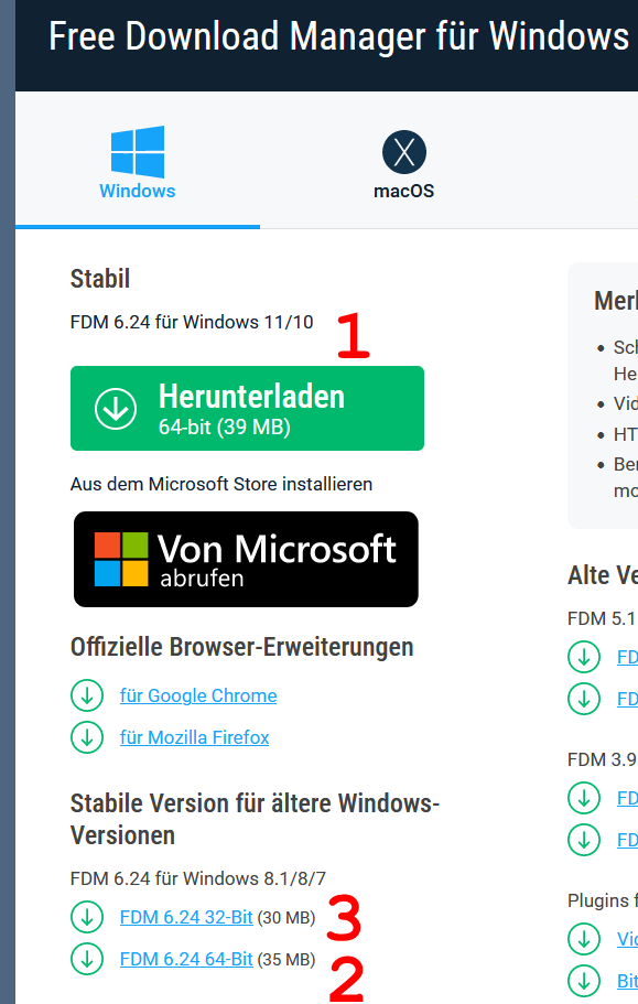 Auf der Website von Free-Download-Manager ist der Download des Programmes der aktuellen Version 6.24 für Windows in drei Teile aufgespalten: