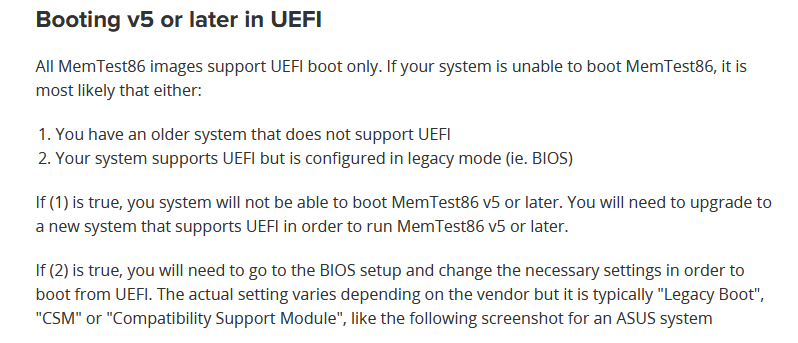 "Die aktuelle Version von MemTest86 unterstützt kein Booten auf Systemen mit Legacy-BIOS. Für Systeme, die nicht mit UEFI, sondern per Legacy-BIOS booten, wird daher auf dem Boot-Stick eine zweite Partition mit der alten Version 4 angelegt."