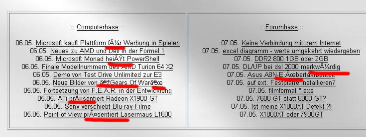 Auf www.computerbase.de wird die Codierung automatisch auf UTF-8 gestellt, da hab ich auch keine Probleme. Die Probleme sind da, wenn die Daten vom Datenserver, welche ich für meine Startseite verwende, benutzt werden.